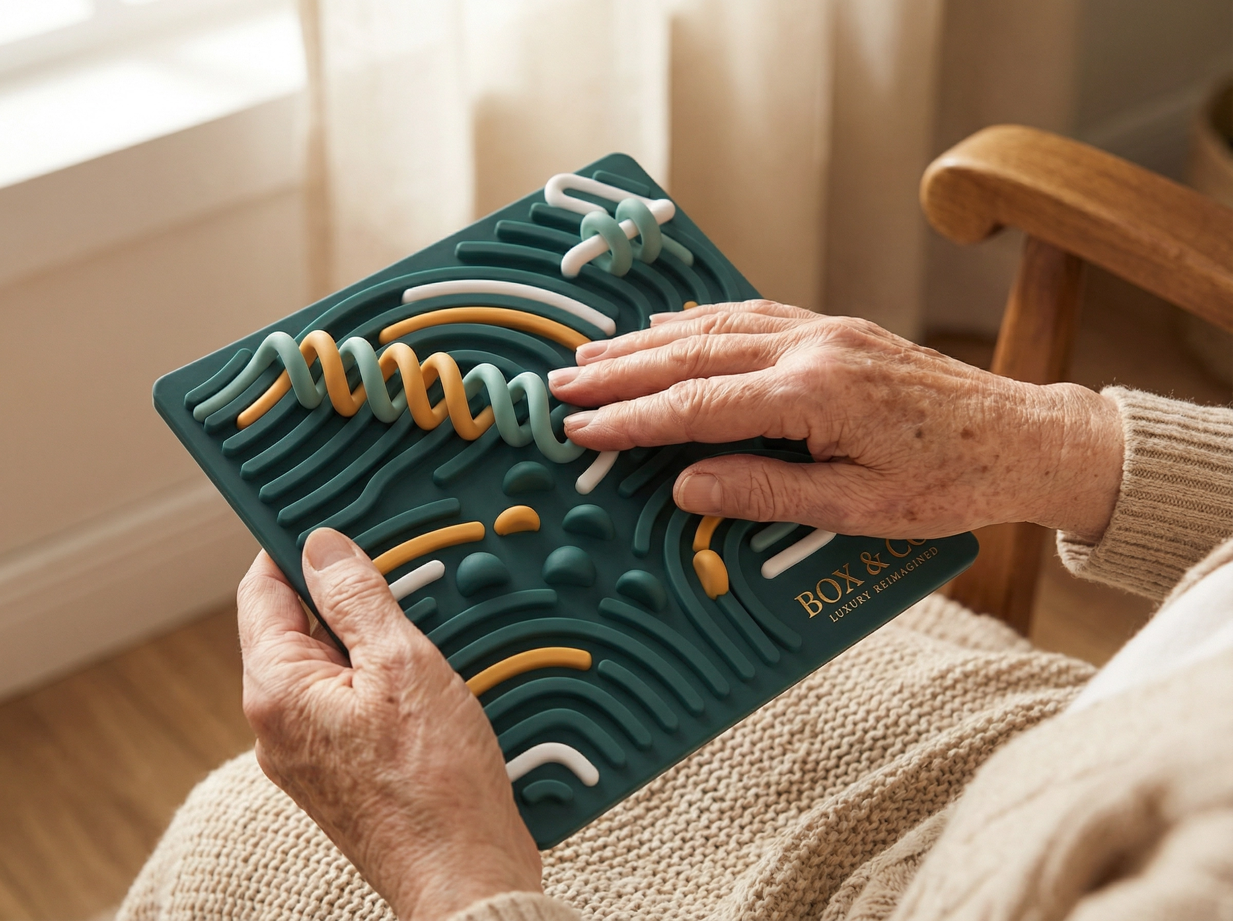 A beautifully crafted sensory engagement board designed to stimulate the mind and soothe the senses. Perfect for seniors and patients, this tactile activity board features a variety of textures, buttons, zippers, and interactive elements that encourage focus, dexterity, and calm. A thoughtful addition to any welcome or care box.